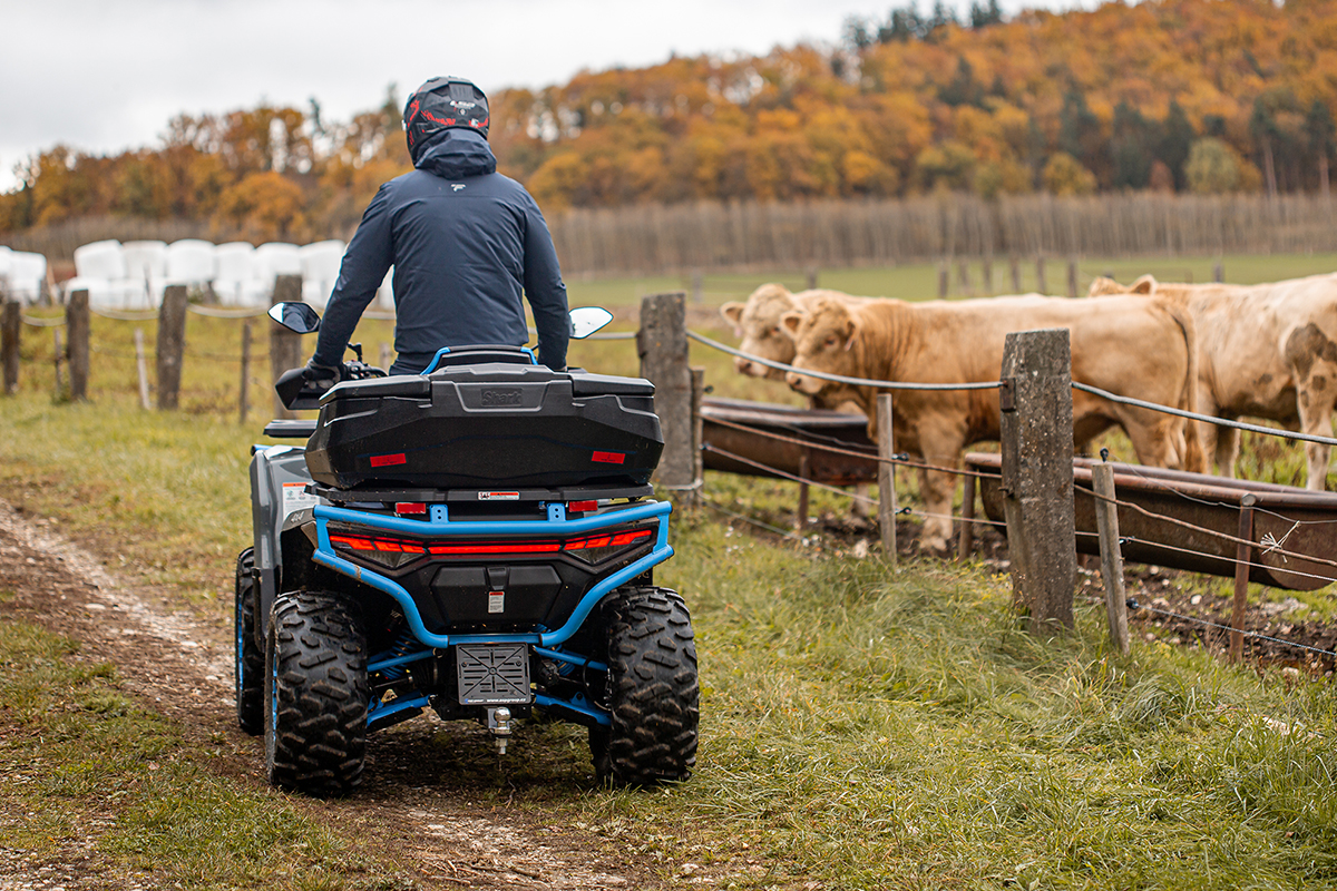 Servodirecție electronică EPS, moduri de pilotare (normal, work), cârlig de remorcare omologat, troliu electric 1360 kg, apărători pentru mâini, bară de protecție față/spate, suporturi bagaje față/spate, scaun cu spătar și mânere pasager, priză 12V, port USB, faruri LED-Matrix