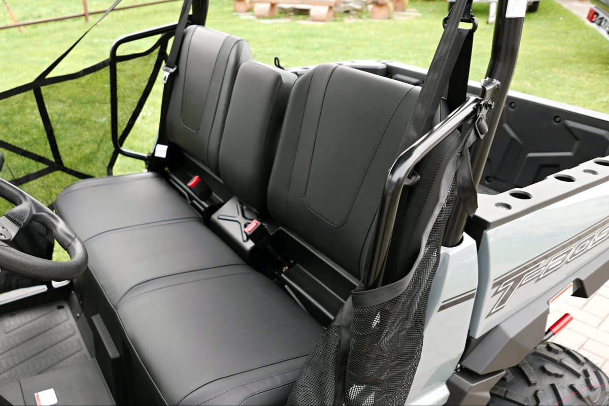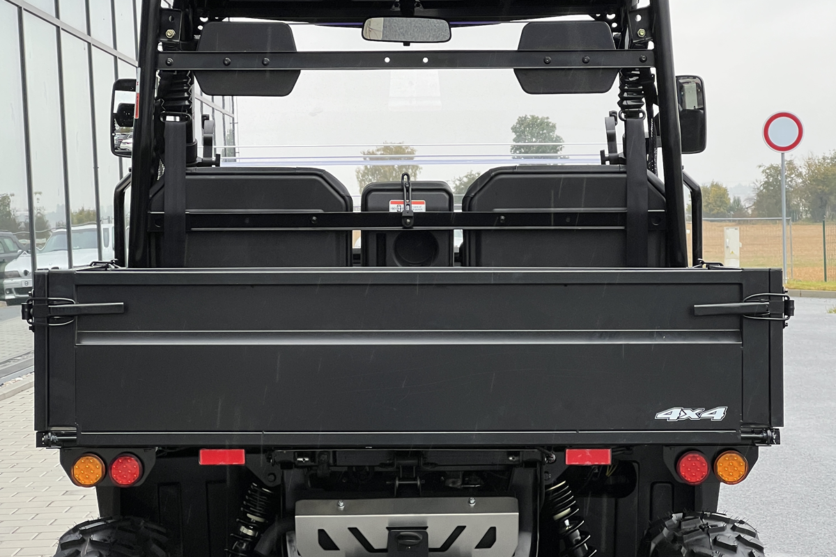 Plafon rigid rezistent la UV, parbriz complet, bară de protecție față, plase de siguranță pentru șofer și pasageri, benă basculabilă, cârlig de remorcare omologat, troliu electric 1360 kg cu telecomandă