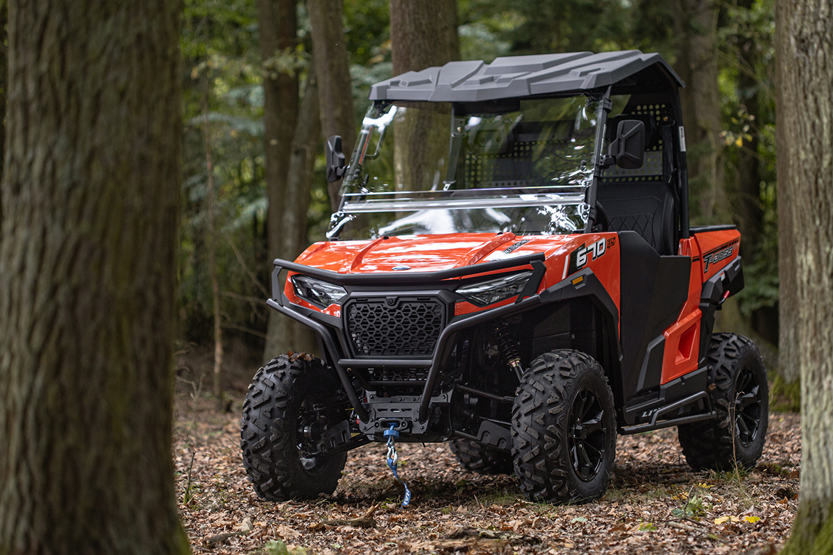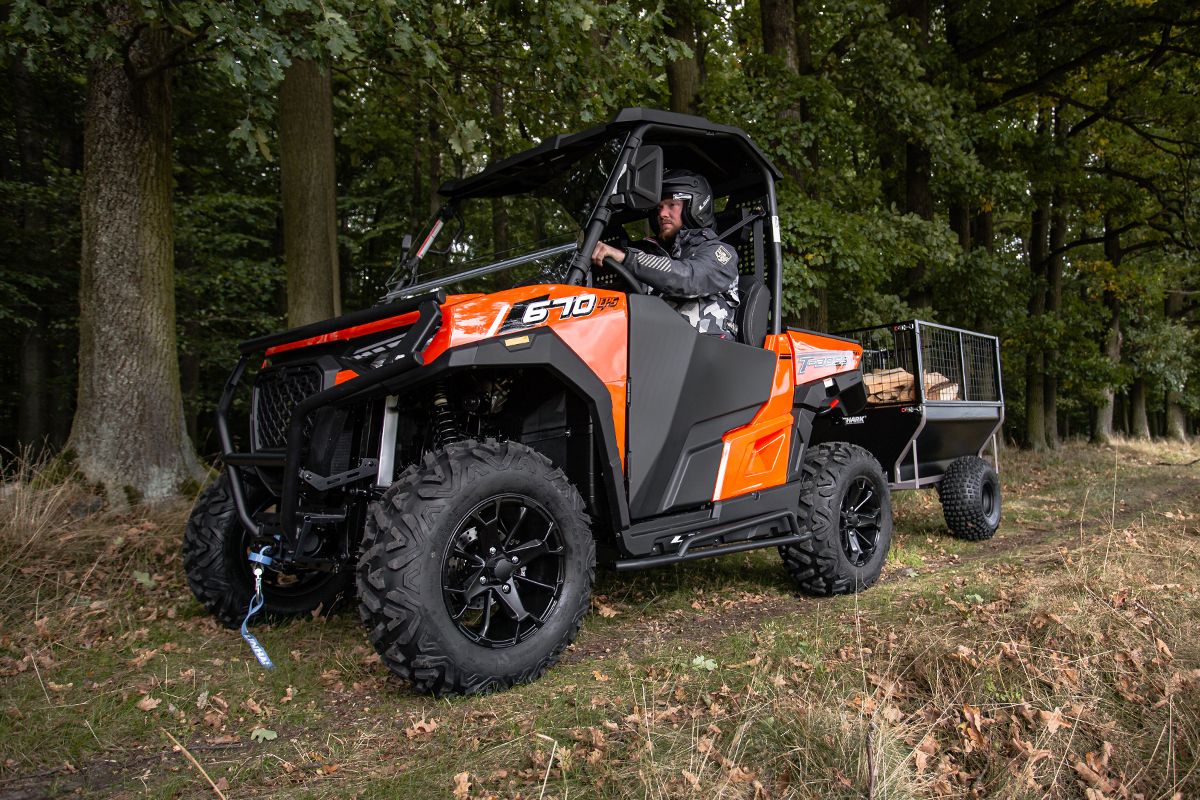 Uși integrale, plafon rigid, parbriz din plexiglas, bară de protecție față, benă basculabilă, cârlig de remorcare omologat, troliu electric cu telecomandă