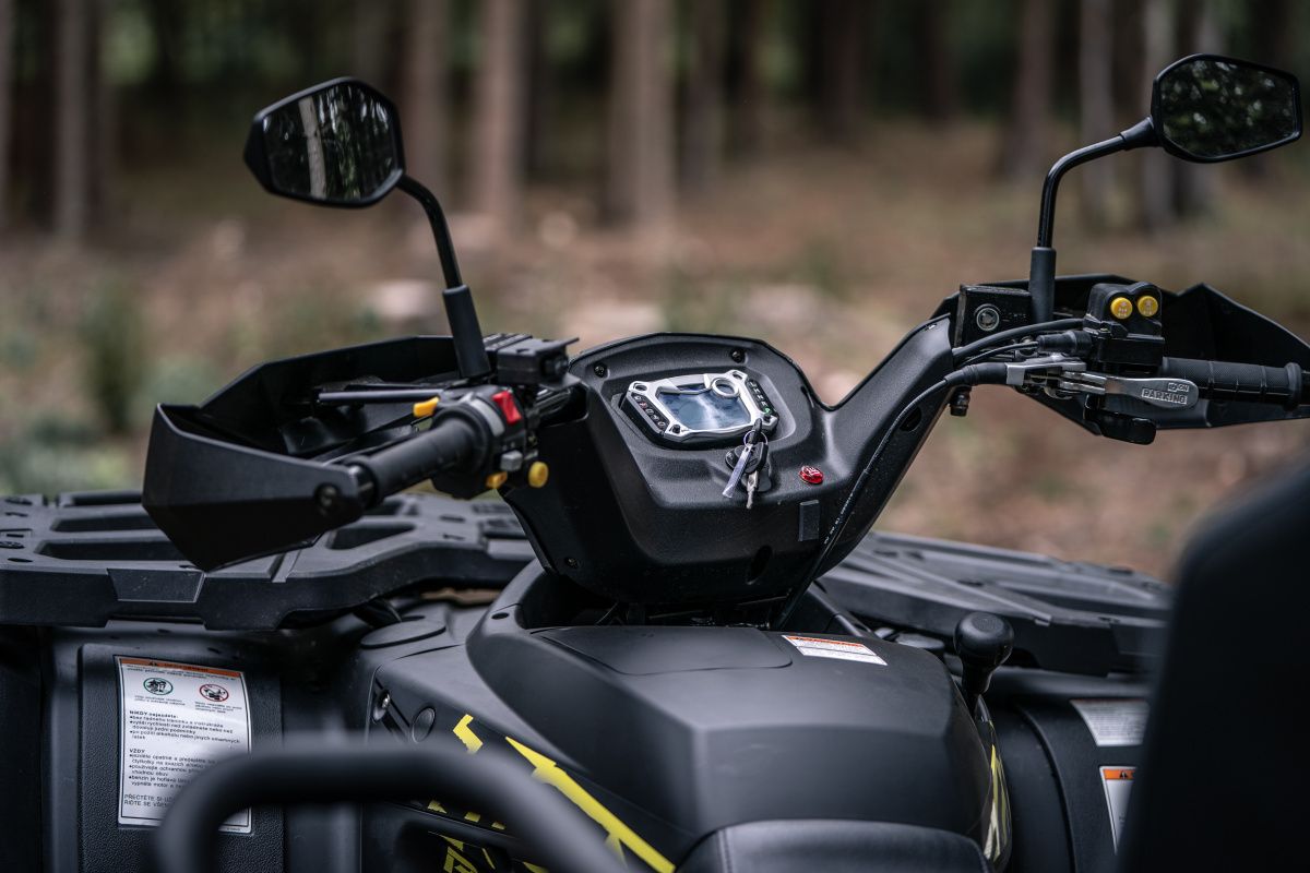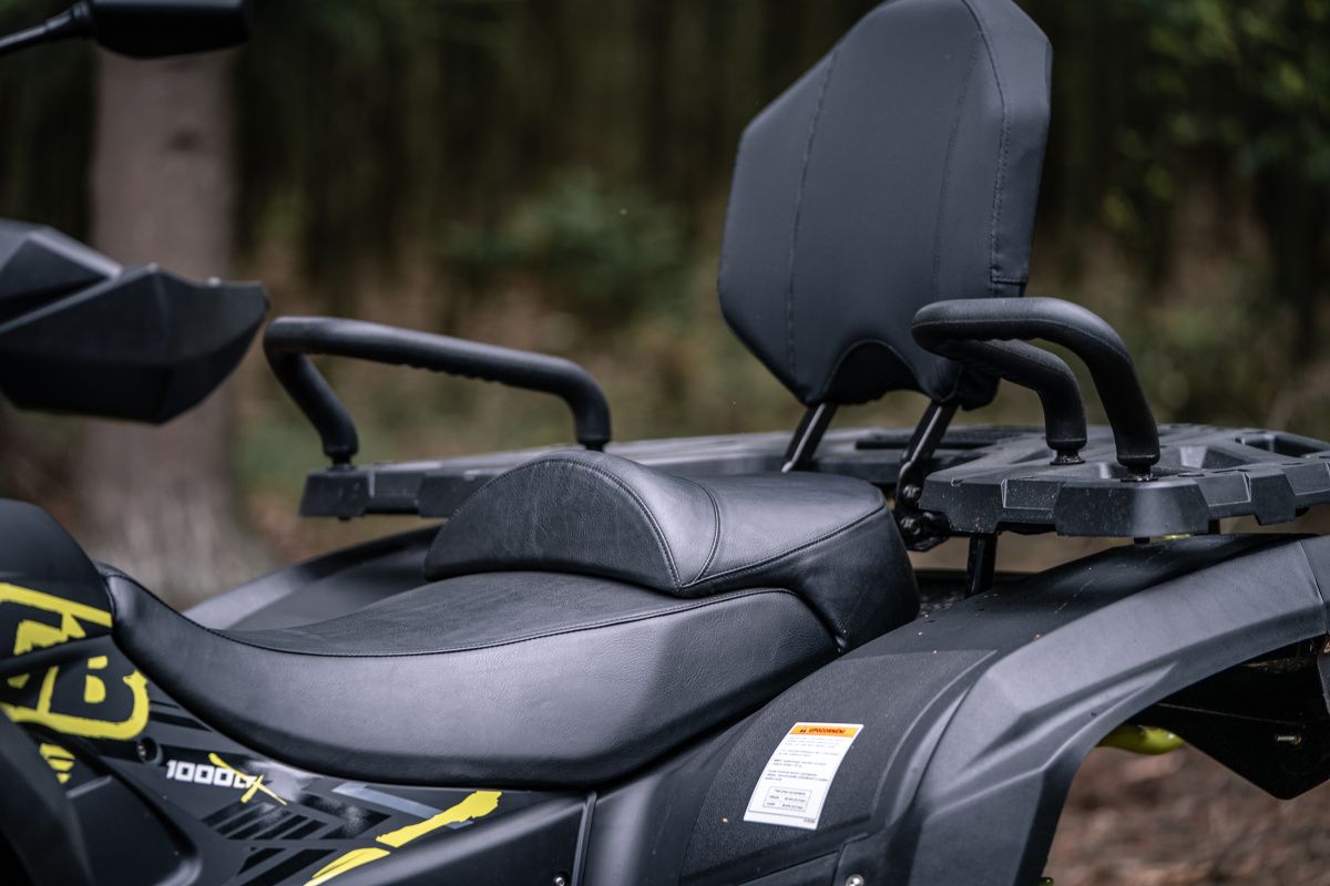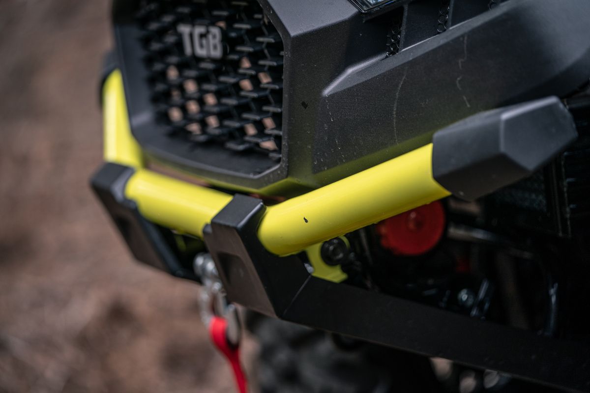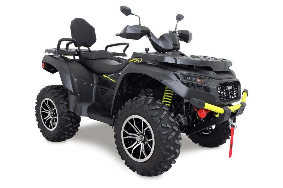 Garda la sol este foarte generoasă, iar șasiul extins oferă spațiu pentru 2 persoane. În varianta standard sunt incluse troliu puternic, jante din aluminiu de 14”, cârlig de remorcare și grilă față complet detașabilă pentru curățare ușoară.